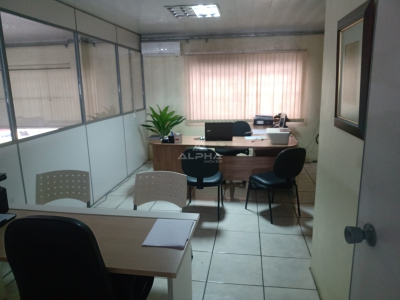 Sala ampla principal, 2 salas para escritório, banheiro, mesanino e depósito.